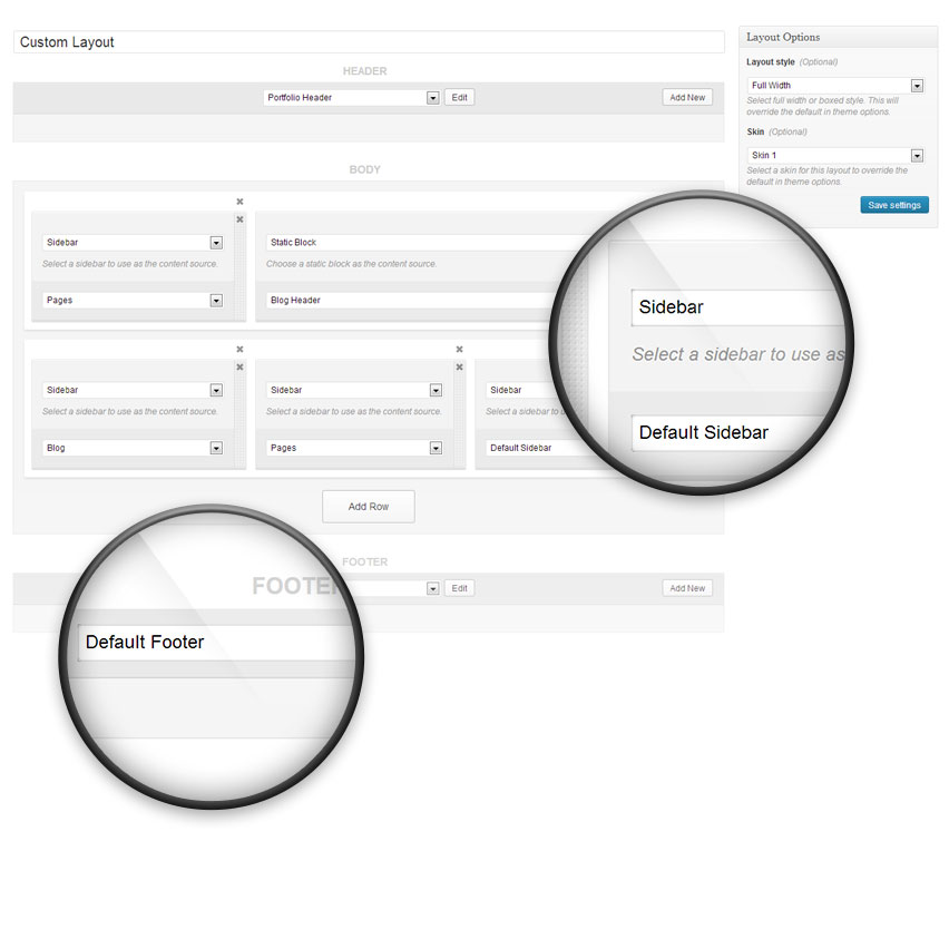 Custom layouts, sidebars, headers and footers anywhere on your site. Build your website the way you want with the drag and drop layout manager. Set your column widths, select content sources, apply custom skins and much more. It’s easy to use and lets you build your own layouts quickly without editing any files.